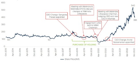 In 2020 we wrote a letter to the group chairman, Mr Anand Mahindra, highlighting our concerns around the capital allocation of the group and the poor performance of Mahindra Lifespaces. We received a prompt reply in which he acknowledged our concerns and mentioned that the group is setting up a new capital allocation framework. He referred us to Dr Anish Shah, the deputy CEO who was set to take over as group CEO and was driving this change.