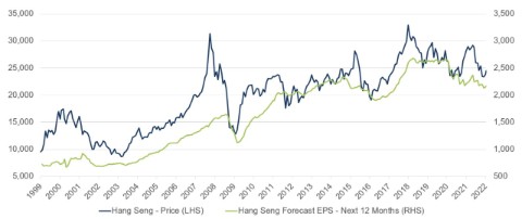 Hang Seng Index Price vs. 12-month EPS Forecasts